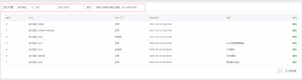 Centos6使用的是iptables防火墙。Centos7使用的是firewall防火墙。debian/ubuntu使用的是ufw防火墙。若是使用的firewall防火墙会直接读取防火墙配置文件,将所有规则显示出来,其他的只会显示面板操作过的规则。