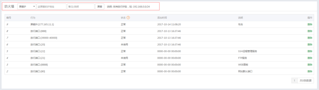 屏蔽IP,可防止指定IP恶意攻击或访问。IP屏蔽成功后,可以查看防火墙列表查看当前IP屏蔽的情况。