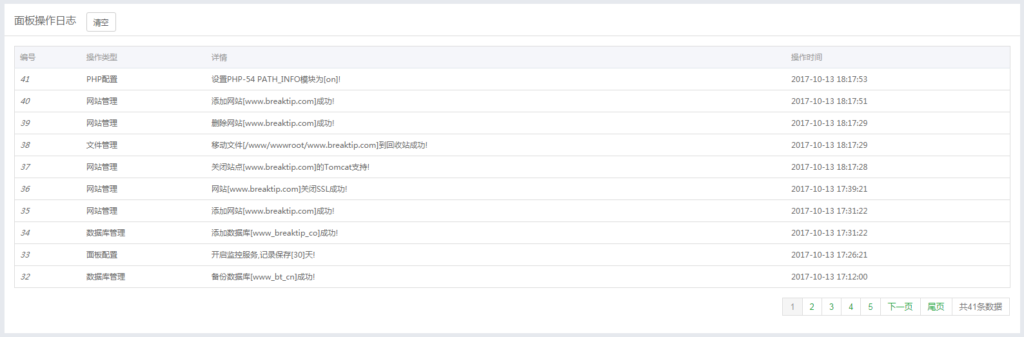 主要记录当前面板操作的日志,比如在面板上站点的添加,数据库的添加,还有面板登录记录等,可用于查询是否有人恶意登录和操作。