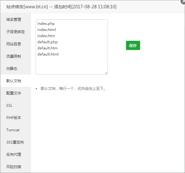设置站点的默认文档,完成修改后,点击保存即可完成。