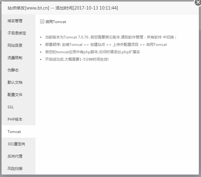 当前版本为Tomcat 7.0.76 ,若您需要其它版本,请到软件管理 – 所有软件 中切换;部署顺序: 安装Tomcat >> 创建站点 >> 上传并配置项目 >> 启用Tomcat若您的tomcat应用中有php脚本,访问时请添加.php扩展名开启成功后,大概需要1-5分钟时间生效!