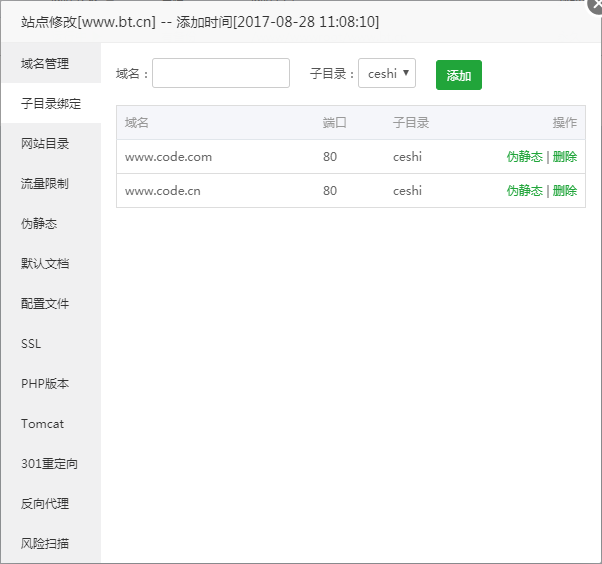 添加子目录的绑定,可以将域名绑定在该WEB站点下的子目录上。可支持单独为该子目录设置伪静态。
