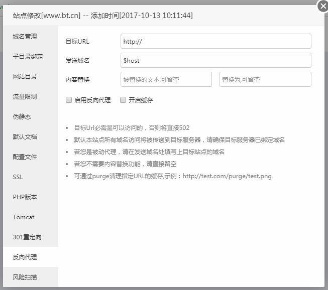 目标Url必需是可以访问的,否则将直接502默认本站点所有域名访问将被传递到目标服务器,请确保目标服务器已绑定域名若您是被动代理,请在发送域名处填写上目标站点的域名若您不需要内容替换功能,请直接留空可通过purge清理指定URL的缓存,示例:http://test.com/purge/test.png