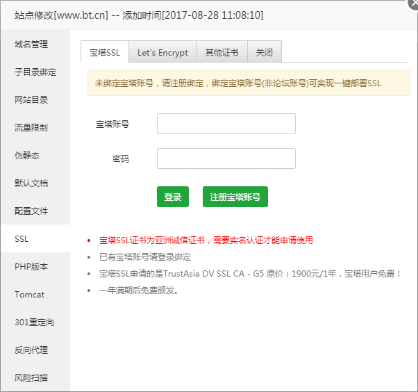 申请之前,请确保域名已解析,如未解析会导致审核失败,宝塔SSL申请的是免费版TrustAsia DV SSLCA – G5证书,仅支持单个域名申请,有效期1年,不支持续签,到期后需要重新申请。