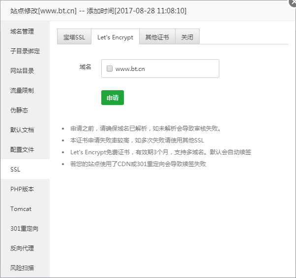 申请前请确保当前域名已解析,如未解析会导致审核失败Let’s Encrypt免费证书,有效期3个月,支持多域名。默认会自动续签若您的站点使用了CDN或301重定向会导致续签失败