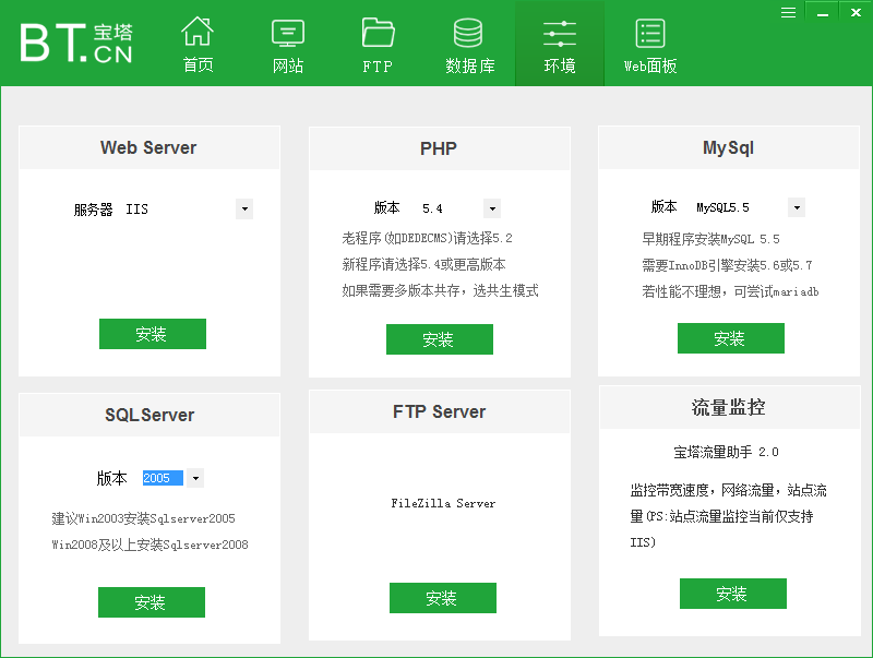 - 环境程序的主要有,IIS、Apache、Nginx、PHP、Mysql、SQL Sever、FTP、流量监控插件。
