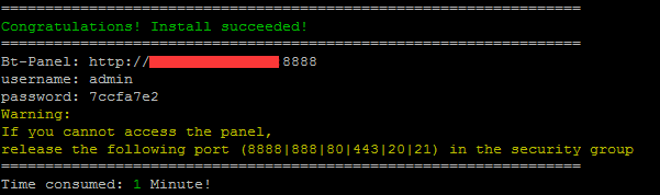 安装完成后,会提示安装成功的提示,面板地址,面板账号还有密码,(如图):