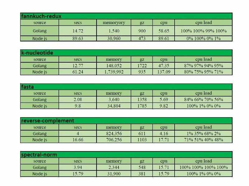 在这个比较中,Go显然优于Node.js,因为它允许通过goroutines进行并发,这导致了比Node.js单线程体系结构更快的进程。