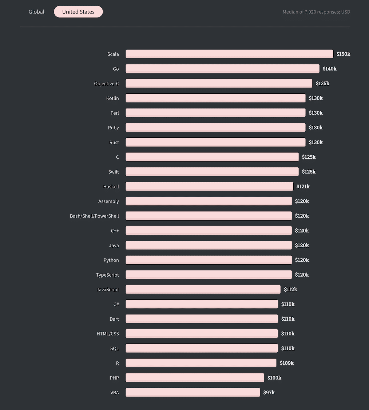 就每项技术的工资而言,让我们看看Stackoverflow Survey 2020。
