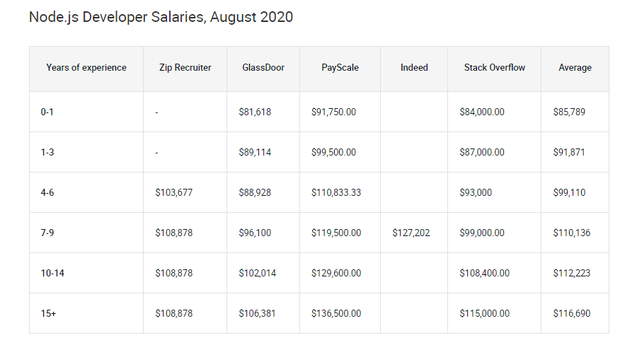 Node.js开发人员的工资在高端运行。这是由于熟练的Node.js开发人员与希望雇佣他们的开发人员之间存在差距。你自己看看: