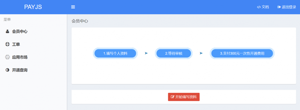 Step 3 -审核通过后,需要支付300元一次性开通费用(相当于PAYJS的开户费,或者你可以称之为技术服务费)。开通之后,你将会获取到一个商户号及通信密钥。