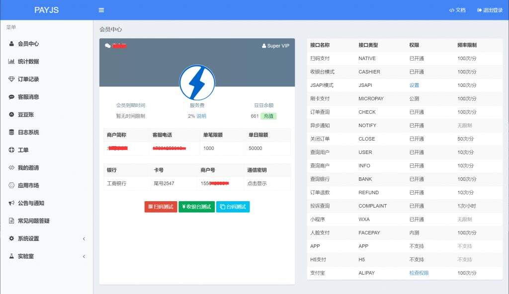 注:我们需要使用到PAYJS的扫描支付和收银台模式接口,务必确保这两个权限已经开通。新申请开通账户暂时没有支付宝接口权限,需要同时满足过去40天交易日达30天、日均交易额100元以上 、日均交易10笔以上、日均支付用户10人以上四个条件才可开通。