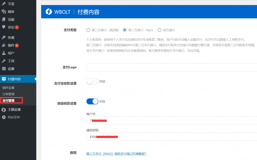 如果你是在闪电博开发的主题或者插件配置PAYJS支付接口,配置很简单,以我们开发的WordPress付费内容插件为例,点击“付费内容-支付管理”进入插件支付设置界面,选择第三方接口-PAYJS。