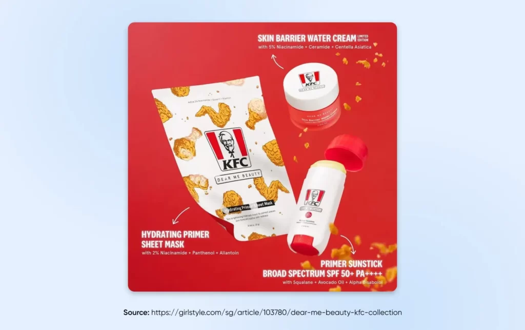 2021 年,印尼美容品牌 “Dear Me Beauty”与肯德基合作推出了一个护肤系列。这不是玩笑。也不是一场热梦。这是一次真实的合作,它让人们停止滚动,然后说:”等等,什么?”