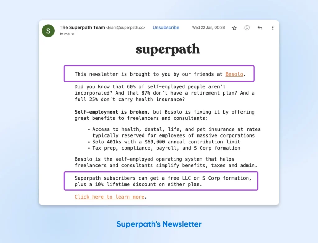 看看内容营销人员的职业资源 Superpath 是如何毫不费力地插入 Besolo 并为该平台提供 Superpath 专享折扣的: