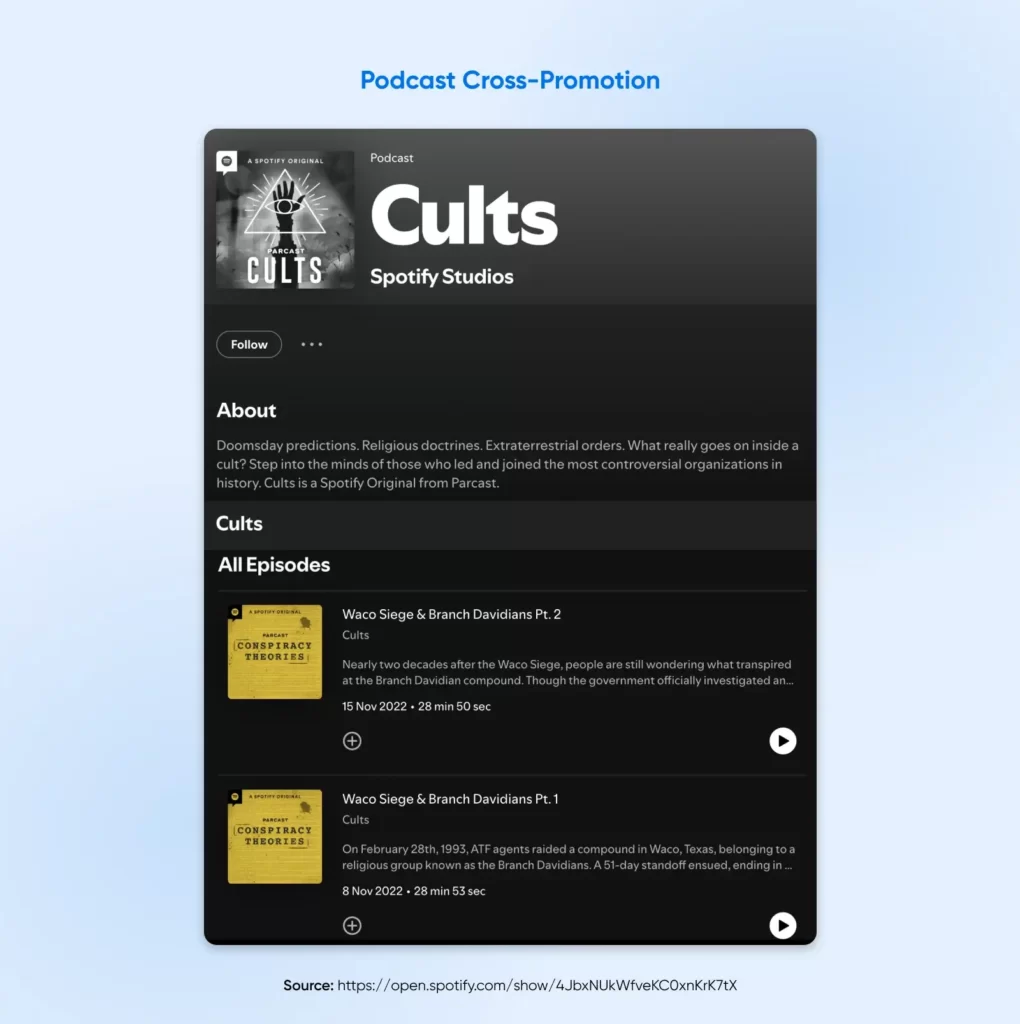 在真实犯罪类节目中也有很多交叉推广的例子。例如,播客 Cults 经常与 Conspiracy Theories 等主题相近的系列节目合作。