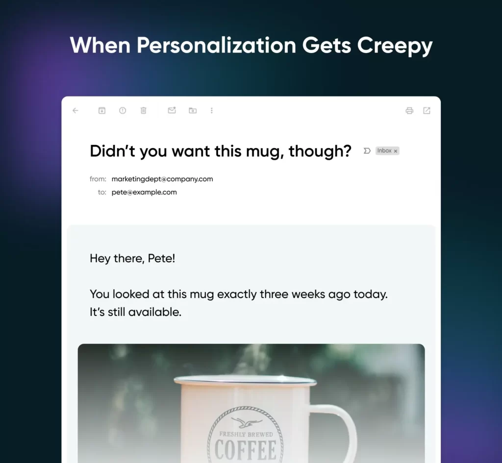 正如我们在“杯子”场景中提到的,过度个性化会给人一种侵犯的感觉,尤其是当你引用收件人从未明确分享过的私人或非常具体的细节时。拥有数据并不意味着需要使用所有数据。