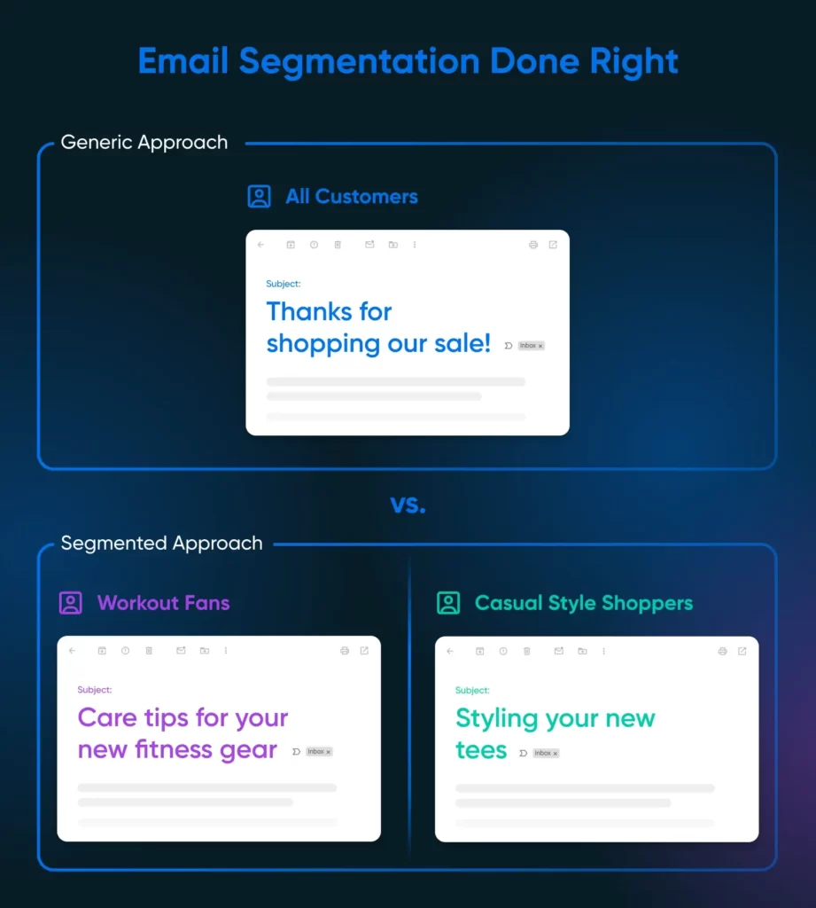 假设你经营一家服装网店。夏季促销结束后,您发现一些顾客购买了健身器材,而另一些顾客则囤积了休闲 T 恤。与其发送一封普通的“感谢您的购物!”邮件,您可以向这两个不同的细分人群发送以下信息: