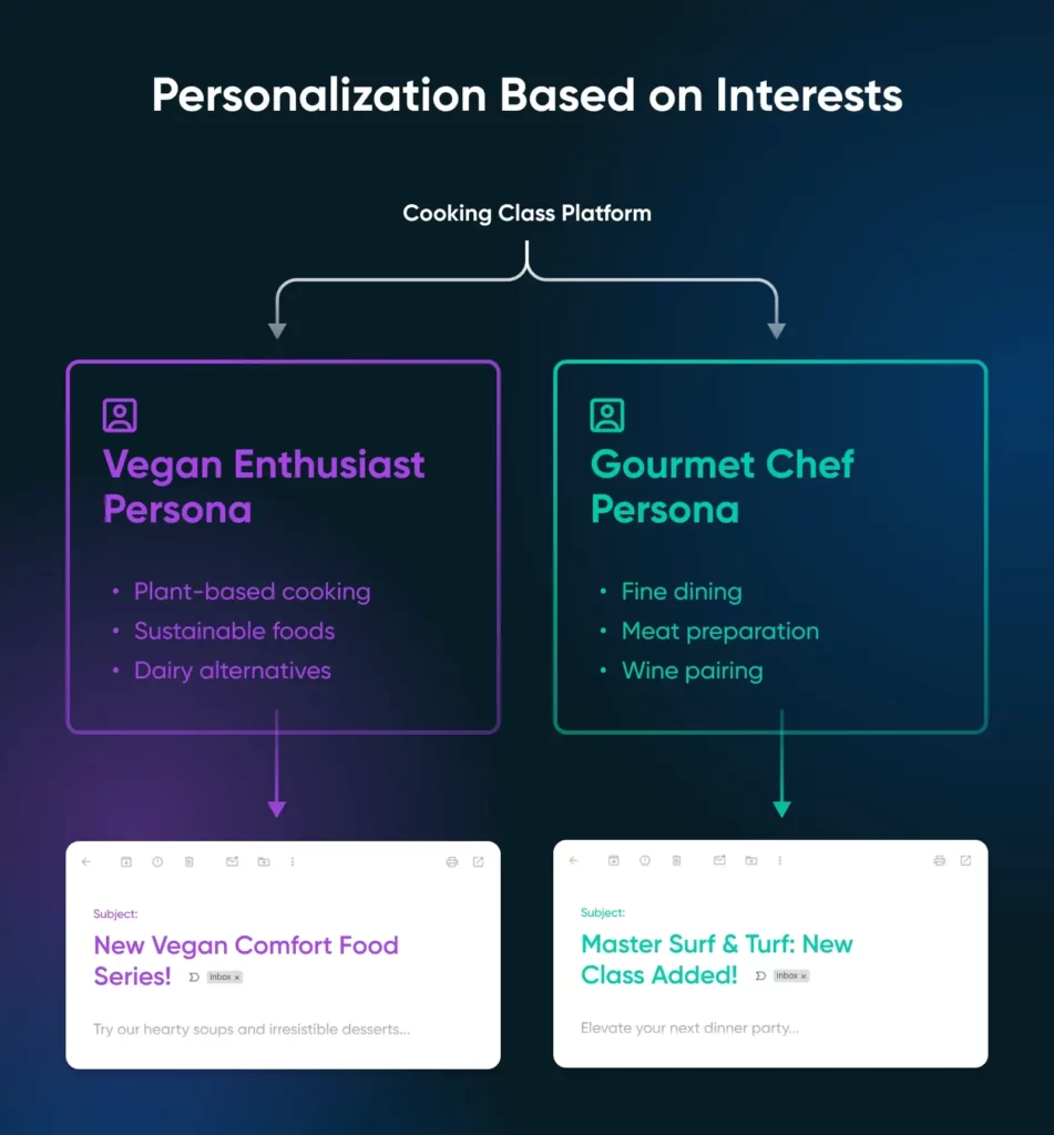 假设您经营着一个小型烹饪课程平台,涵盖从素食烘焙到美食牛排大餐的所有内容。与其发送关于最新课程的一刀切式电子邮件,不如根据学生的已知偏好对时事通讯进行细分。