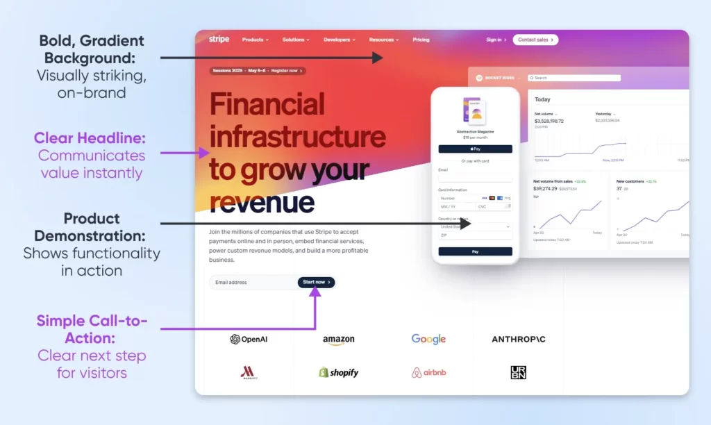 下面是支付处理公司 Stripe 的一个示例,其主页有效地结合了所有这些元素: