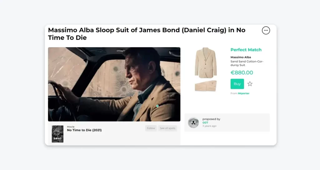 例如,Spotern 网站可以让人们识别并购买他们在电影中看到的服装产品。购买产品的链接用按钮清楚地标示出来,点击后还会提到消费者要去的网店。