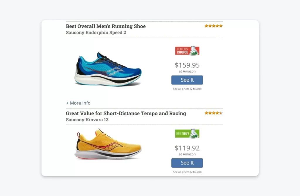 GearLab 也采用了类似的方法。在户外用品的评论中,读者可以点击购买的产品部分与其他内容明显分开。
