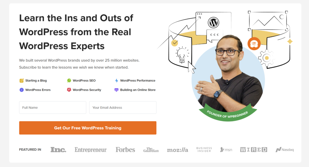 将引人入胜的视觉效果与 CTA 相结合,有助于吸引注意力并激发行动。例如,WPBeginner 在首页通过教程内容清单+专家形象+品牌背书组合设计(无论配色还是排版都非常吸引人)来引导访问者采取特定行动: