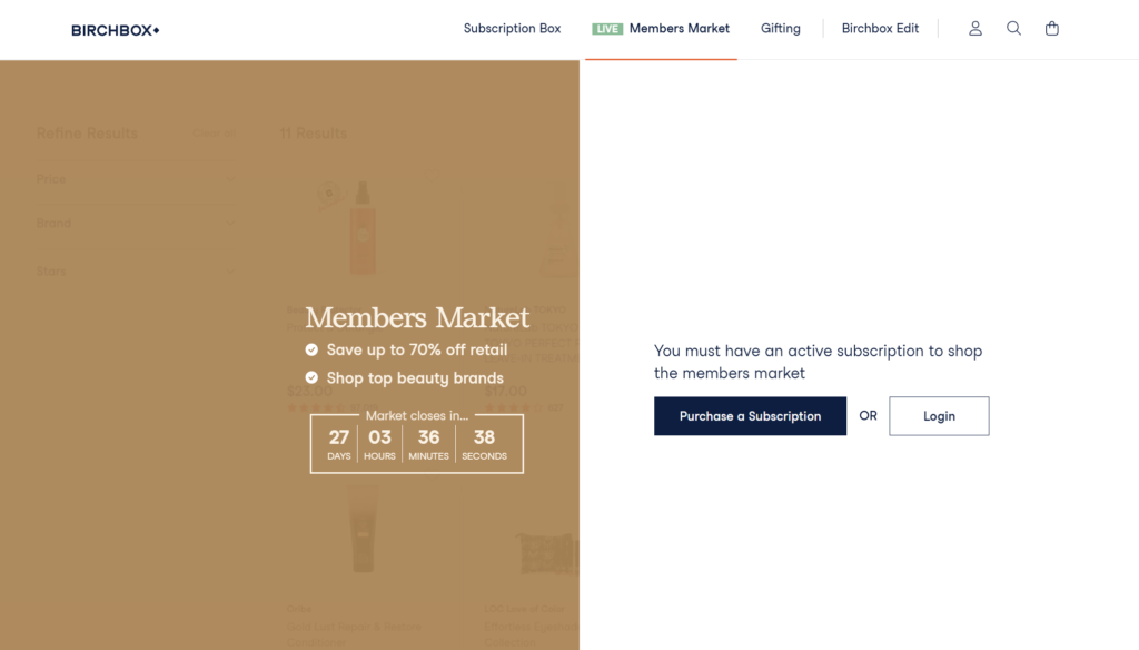彩妆订阅品牌 Birchbox 的登陆页面吸引访客加入他们的类似山姆的 Members Market 并列出会员优势和最后可加入剩余时间。他们正在利用这个 CTA 捕捉销售机会: