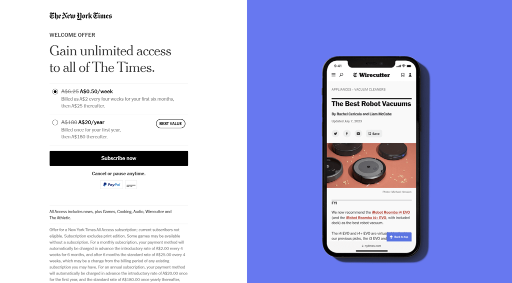 您还可以利用设计来展示价值、强调稀缺性和鼓励及时性。纽约时报在其 CTA 中告诉客户,他们只需花很少的钱(重点突出无限制访问和年订阅超过折扣)就能获得高质量的订阅: