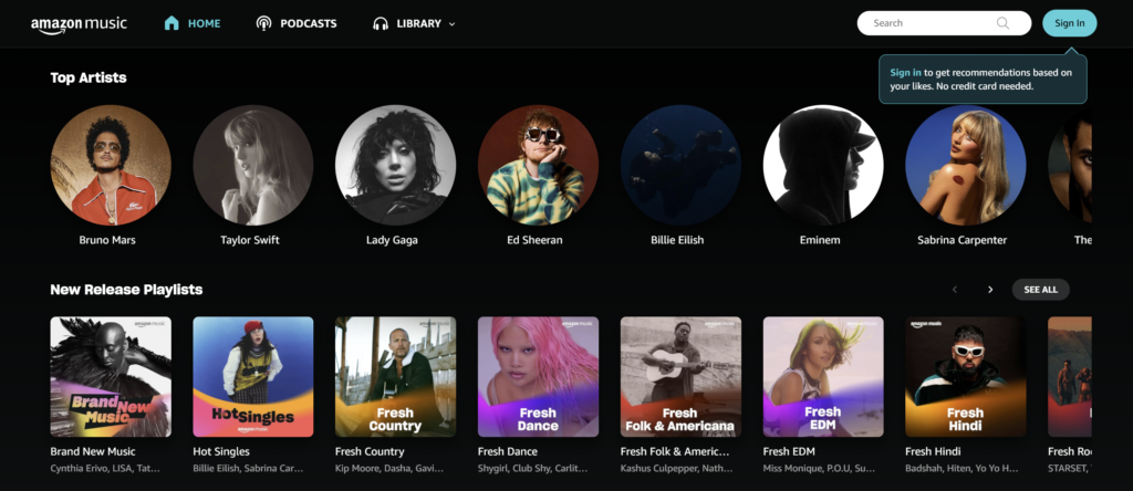 - 亚马逊音乐在页面顶部使用了带提示词的 CTA。