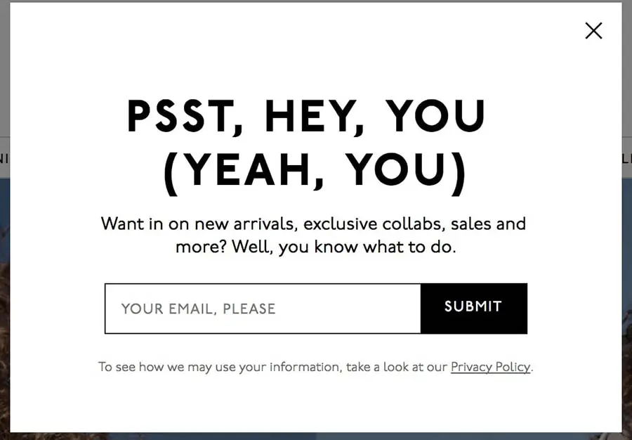 下面则是 Madewell 希望扩大其电子邮件订阅列表。这家服装公司通过巧妙的弹出式信息邀请访客订阅: