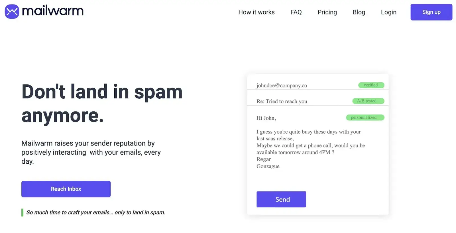 - Mailwarm 承诺为潜在客户解决问题。如果您注册,您的电子邮件就不会再被发送到垃圾邮件中。