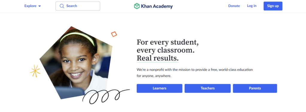 - Khan Academy 重点突出它是一家非营利组织,其使命是为任何人、任何地方提供免费的世界级教育。