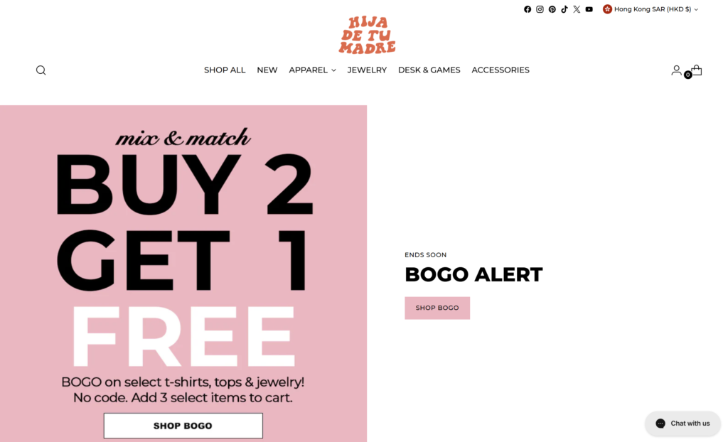 - 这个 CTA 告诉顾客“SHOP BOGO”。现在参与 Hija De Tu Madre 促销活动,买2送1。