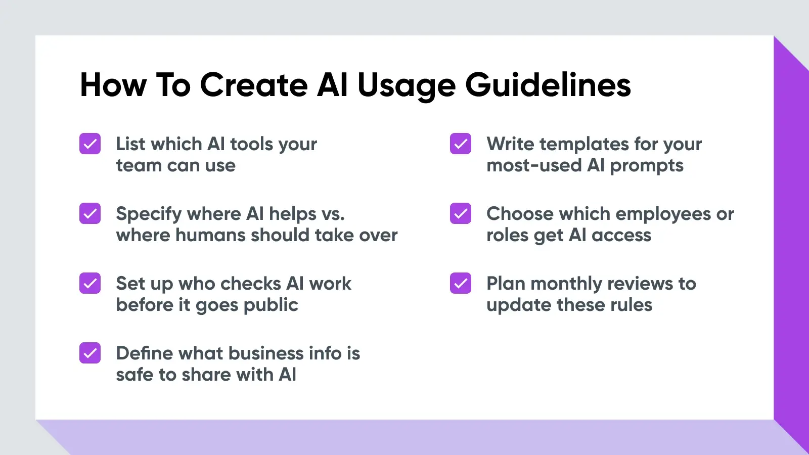 - 制定明确的人工智能使用政策:需要指导的不仅仅是人工智能。确保您的团队知道何时适合使用人工智能,何时应避免使用。