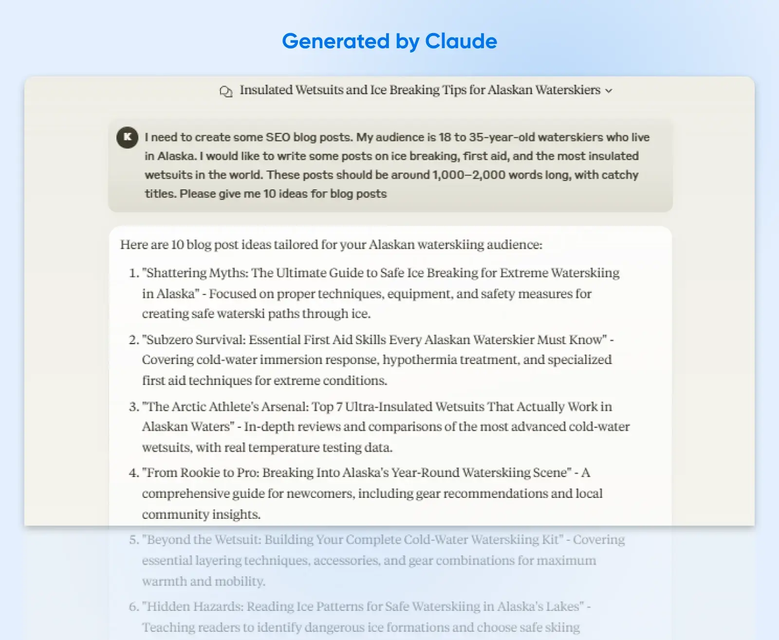 提示示例:我需要创建一些搜索引擎优化博文。我的受众是居住在阿拉斯加的 18 至 35 岁的滑水爱好者。我想写一些关于破冰、急救和世界上最隔热的潜水衣的文章。这些文章的篇幅应在 1,000-2,000 字左右,标题要醒目。请给我 10 个博文创意。