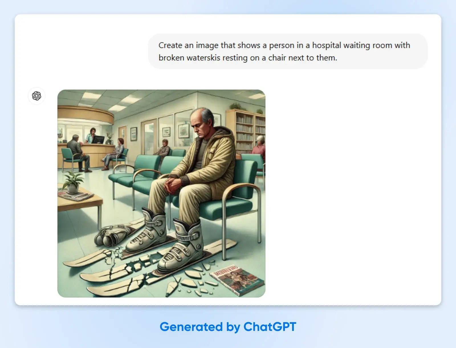 示例提示:Create an image that shows a person in a hospital waiting room with broken waterskis resting on a chair next to them.