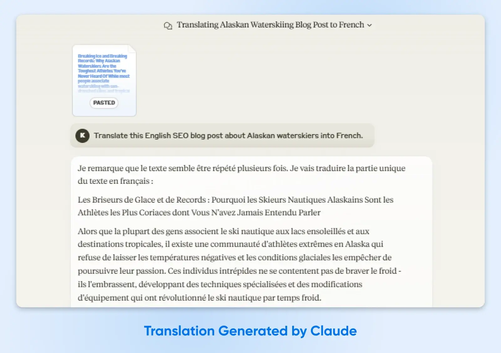 示例提示:Translate this English SEO blog post about Alaskan waterskiers into French.[PASTED POST]
