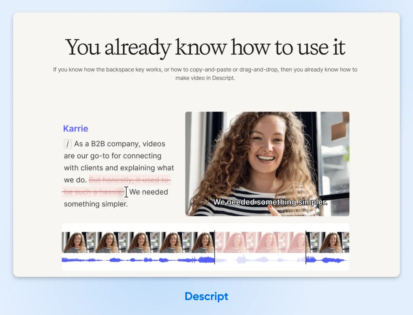 专业建议:如果你录制营销视频,可以尝试使用 Descript 。这个由人工智能驱动的平台可以将完整的视频剪辑成片段,编辑音频以便在播客中分享,甚至还能创建书面转录!