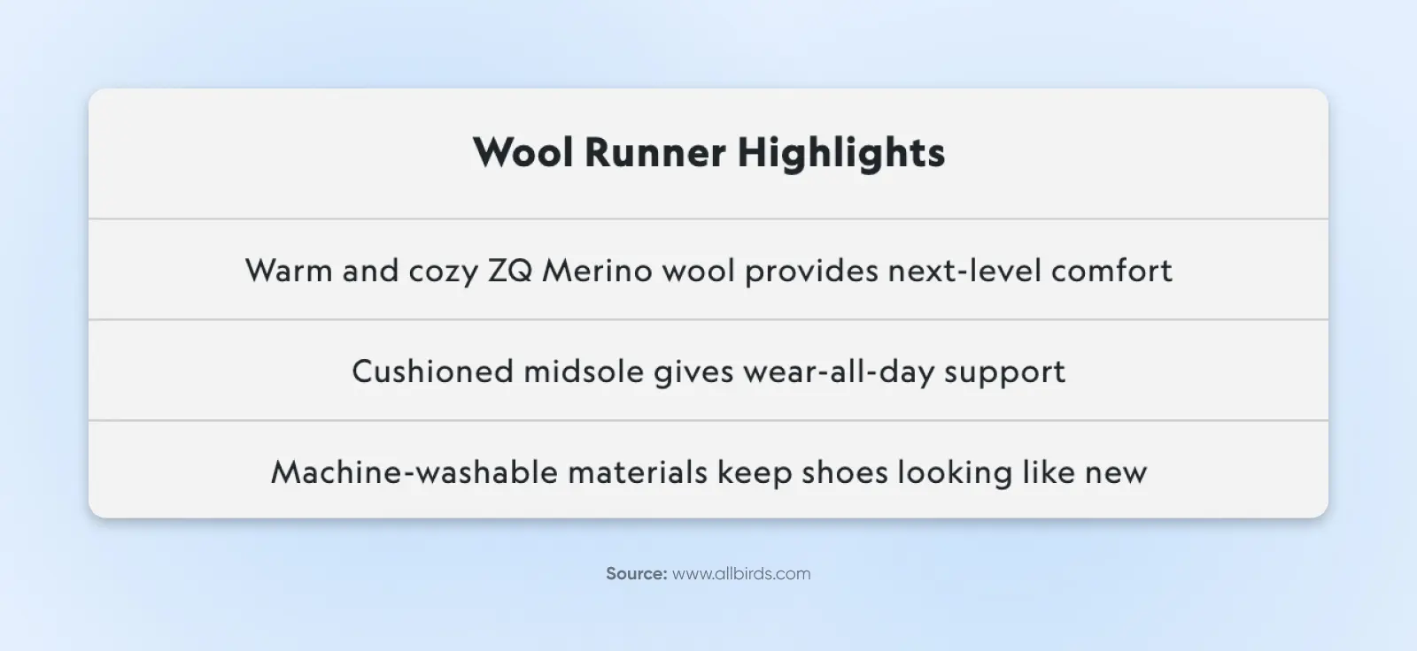 Allbirds 在突出其鞋子的一些优点方面做得非常出色,而且没有啰嗦。它们的主要优点都用简短、贴心的文字说明,直奔主题。