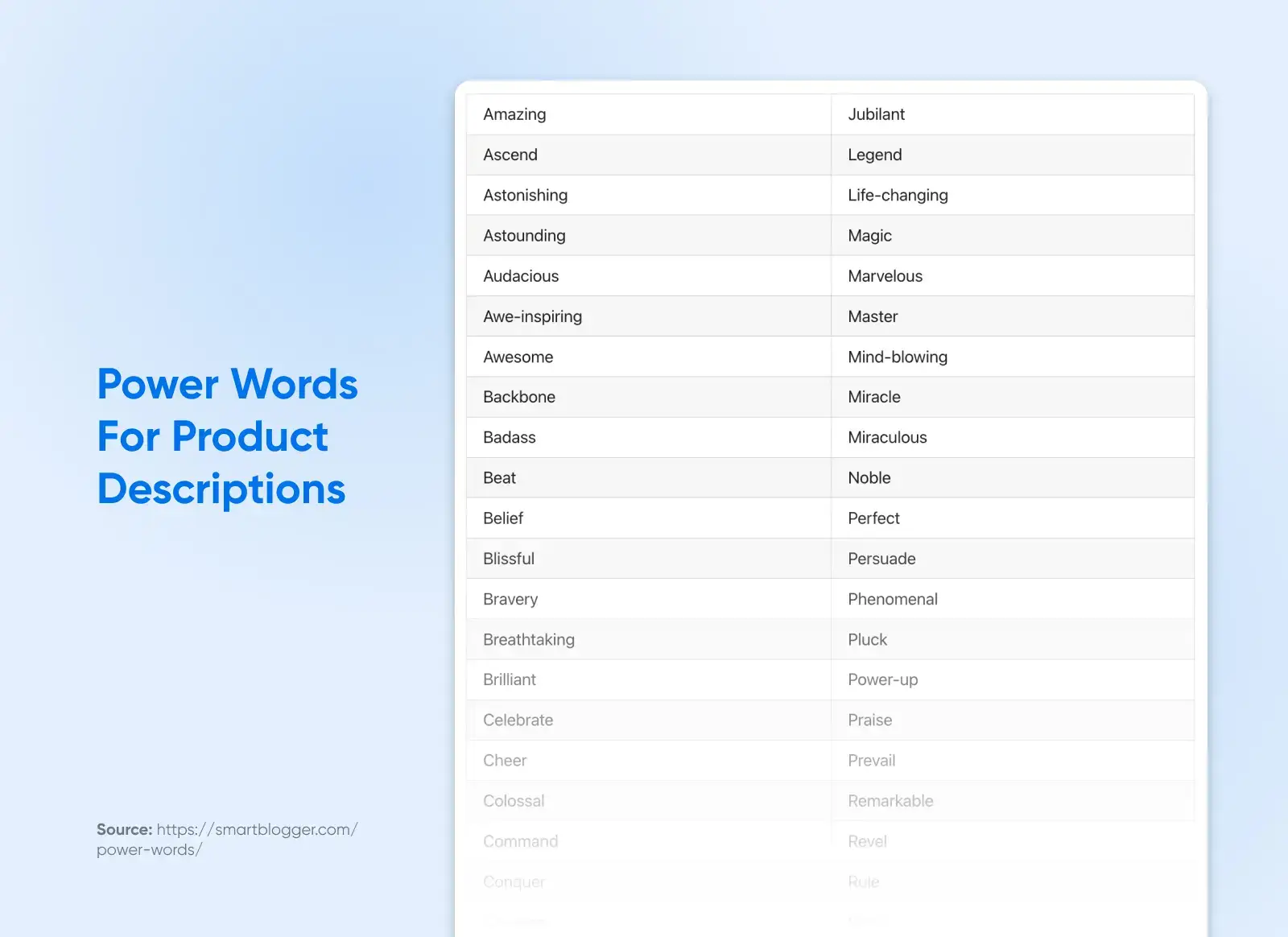 SmartBlogger 的乔恩-莫罗(Jon Morrow)也列出了一份类似的有力词语清单,这些词语能触动客户的情感,使他们更愿意接受你的信息。