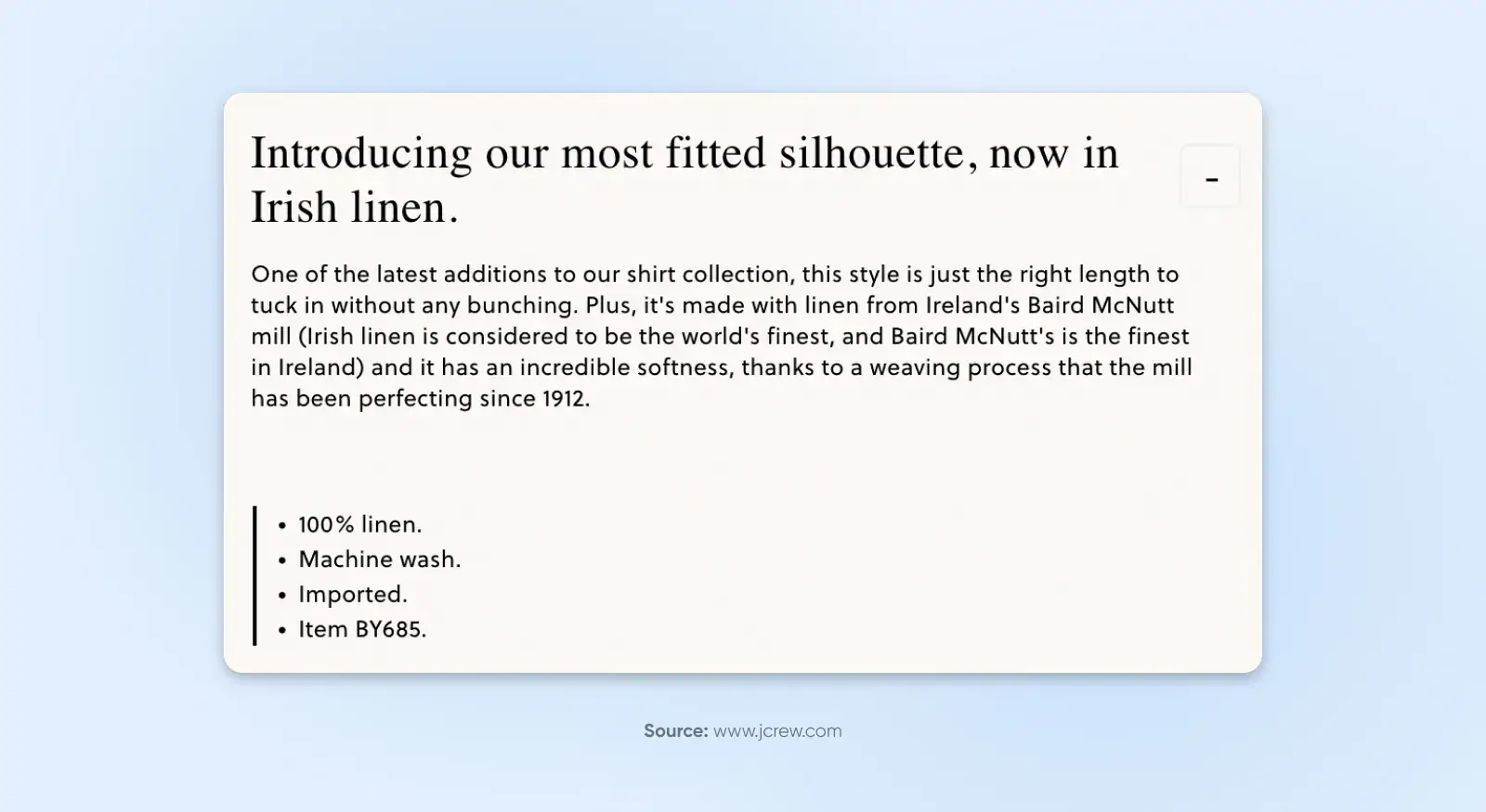 J.Crew 在这方面做得很好。在醒目的标题和较长的描述(利于搜索引擎优化!)下面,他们用一个易于扫描的要点列表突出了产品特点。