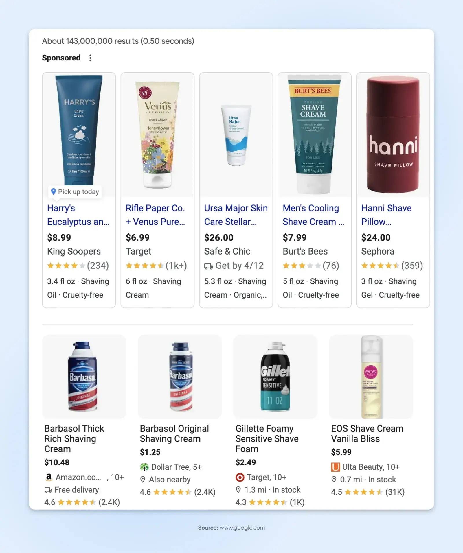 例如,当您在 Google 上输入“剃须膏”时,Google 会显示大量产品。