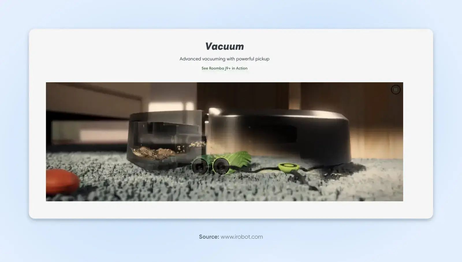 iRobot 公司的 Roomba 产品页面就是一个出色的产品图片和精彩视频的企业范例,它采用了多种媒体形式,向消费者准确展示了其著名吸尘器产品的每个版本是如何工作的。