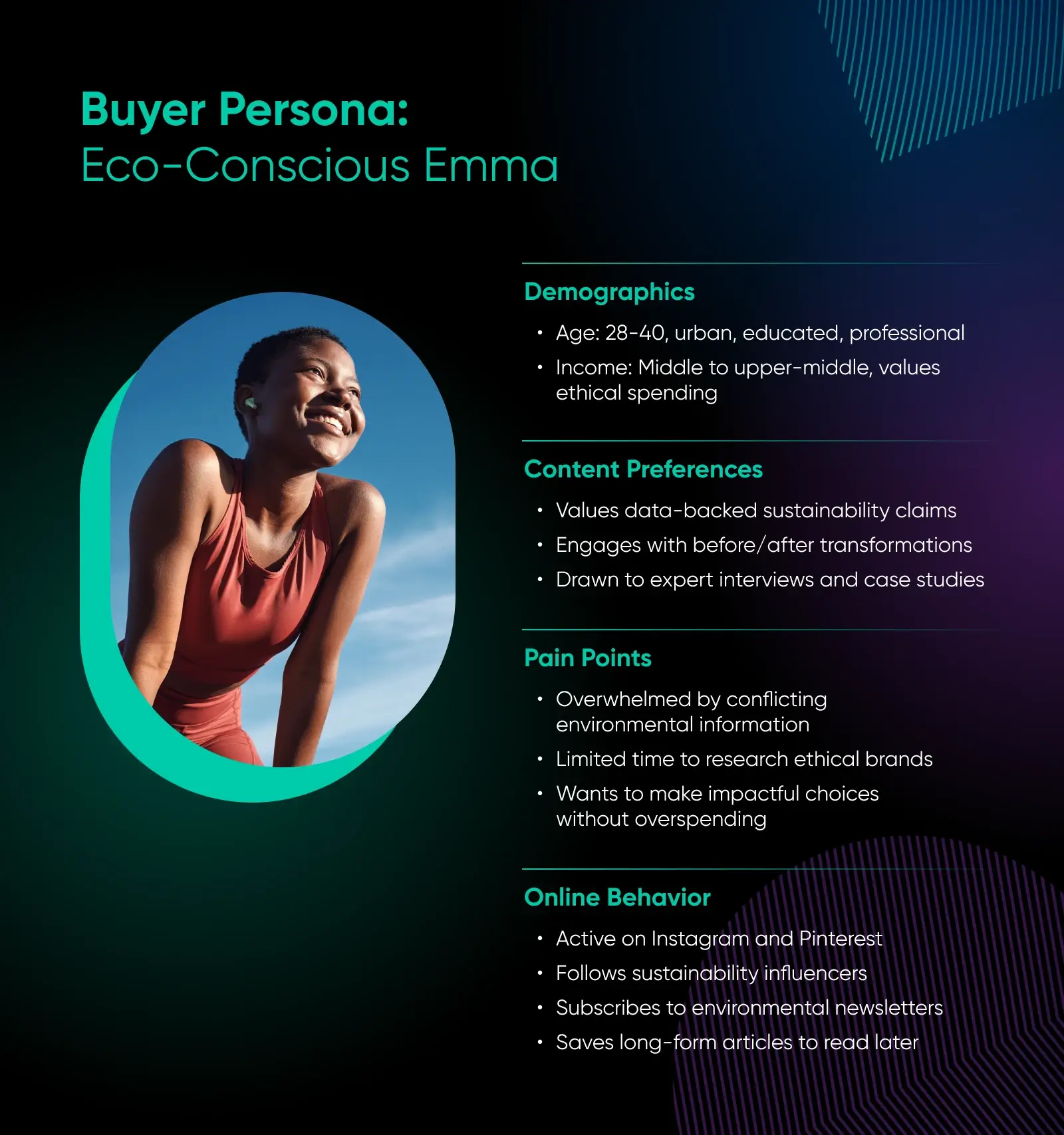 - 他们是谁?想想人口统计,甚至是“忙碌的父母在寻找健康的膳食点子”这样宽泛的描述。