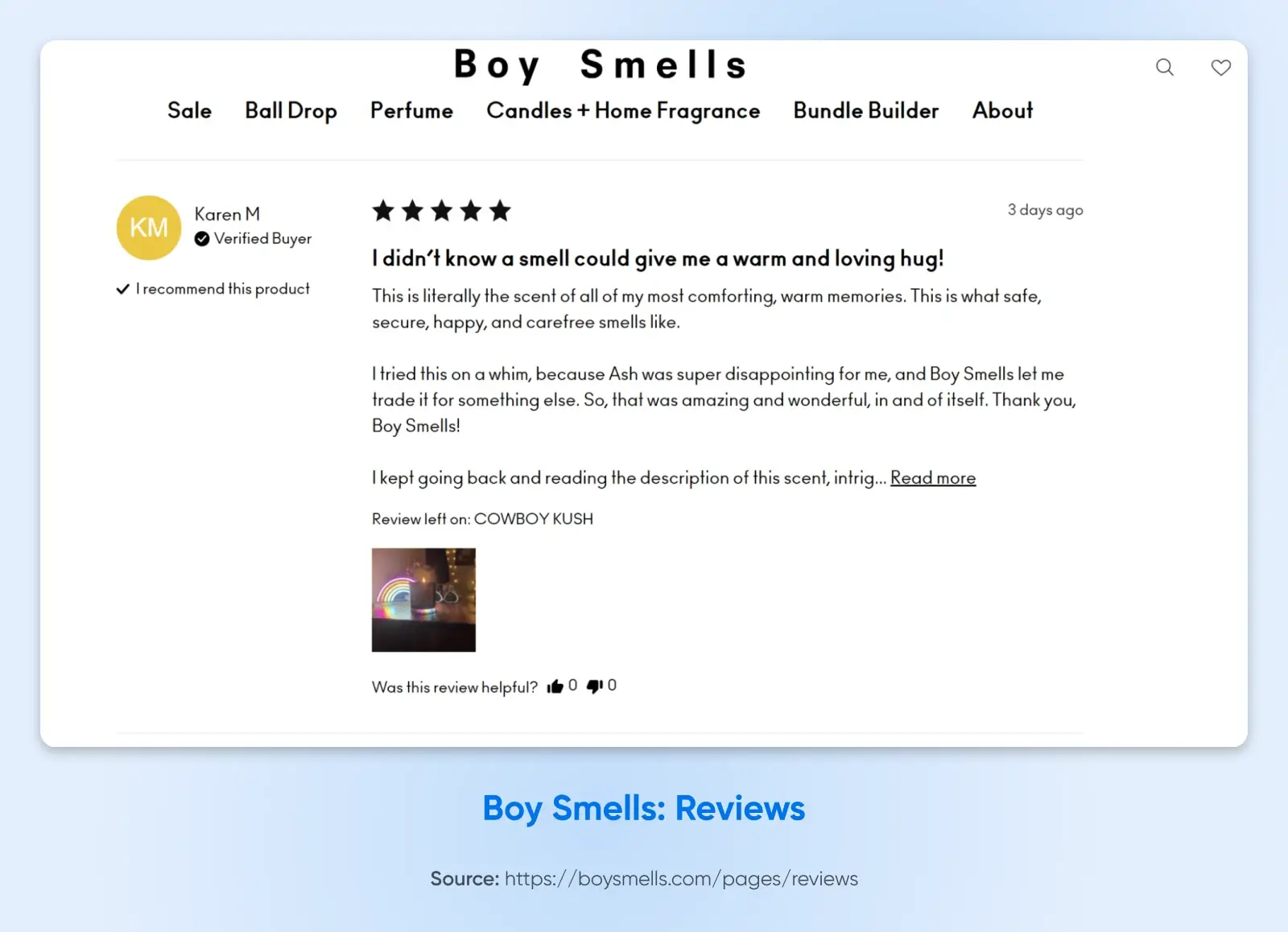 蜡烛品牌 Boy Smells 就在网站上自豪地展示了他们的评价(好的或坏的)。