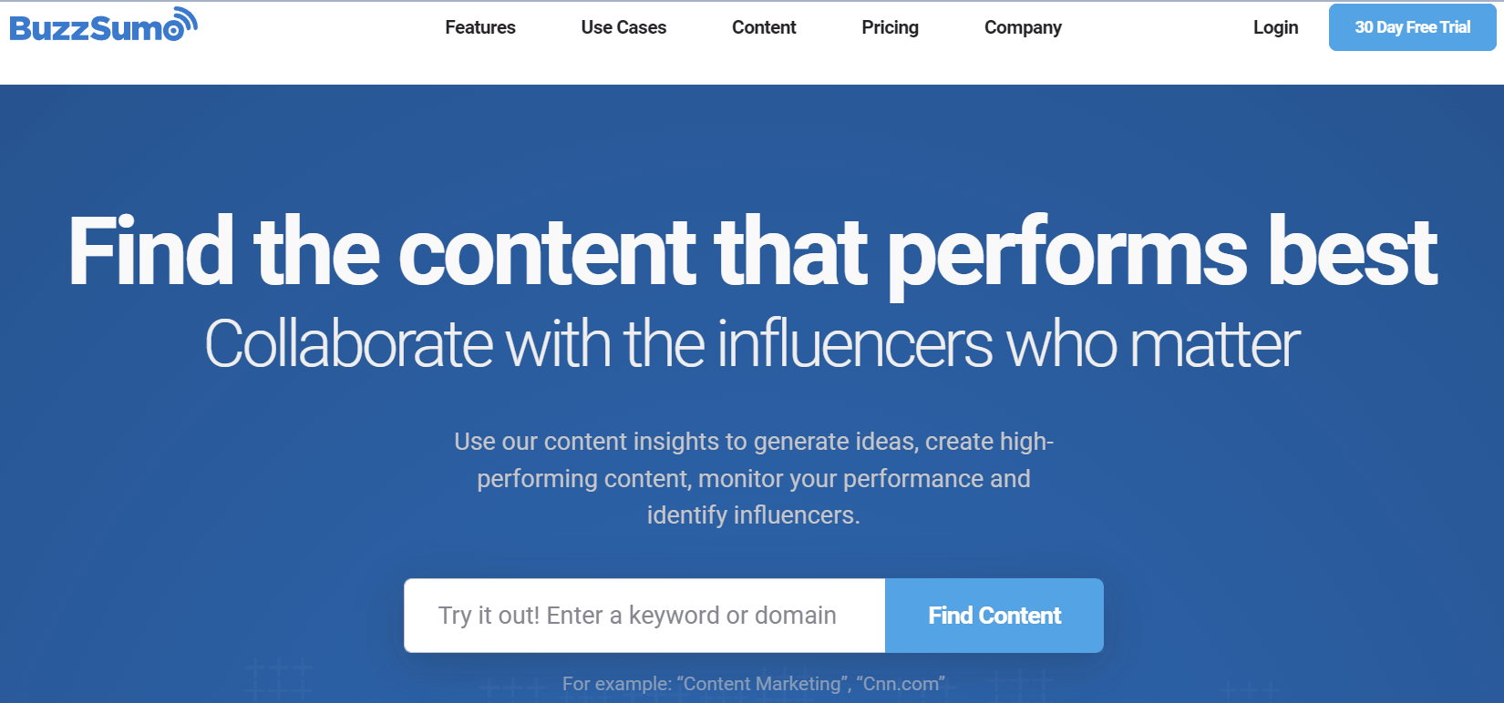 如果你正在寻找新的内容创意或洞察当前趋势,BuzzSumo 可能是你的不二之选。这个一体化工具可以帮助你完成社交媒体营销计划的各个部分,从了解竞争对手到内容研究。