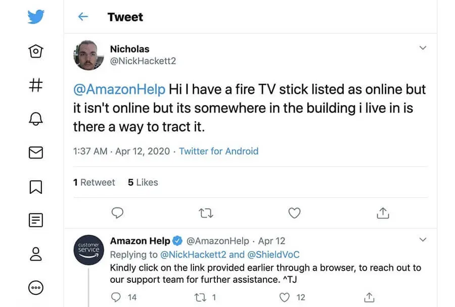 亚马逊的 Twitter 支持账户尤其出名。通过将整个个人主页用于帮助客户,它可以快速回答用户的问题。例如,这条特殊的回复是在客户发出第一条推文九分钟后作出的: