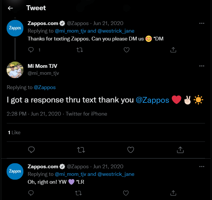 例如,时尚品牌 Zappos 经常使用 Twitter 来回答客户问题和回应反馈: