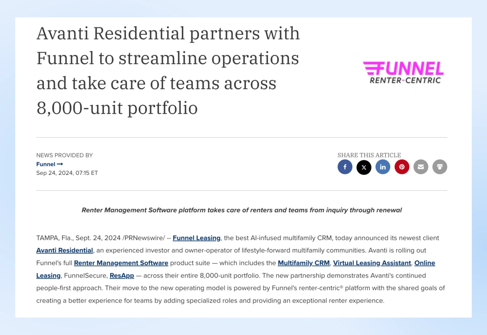 例如,请看这篇新闻稿的第一段。这段话概括了整条新闻,包括 Funnel 和 Avanti 是谁,他们是做什么的,他们计划如何精简运营等等。